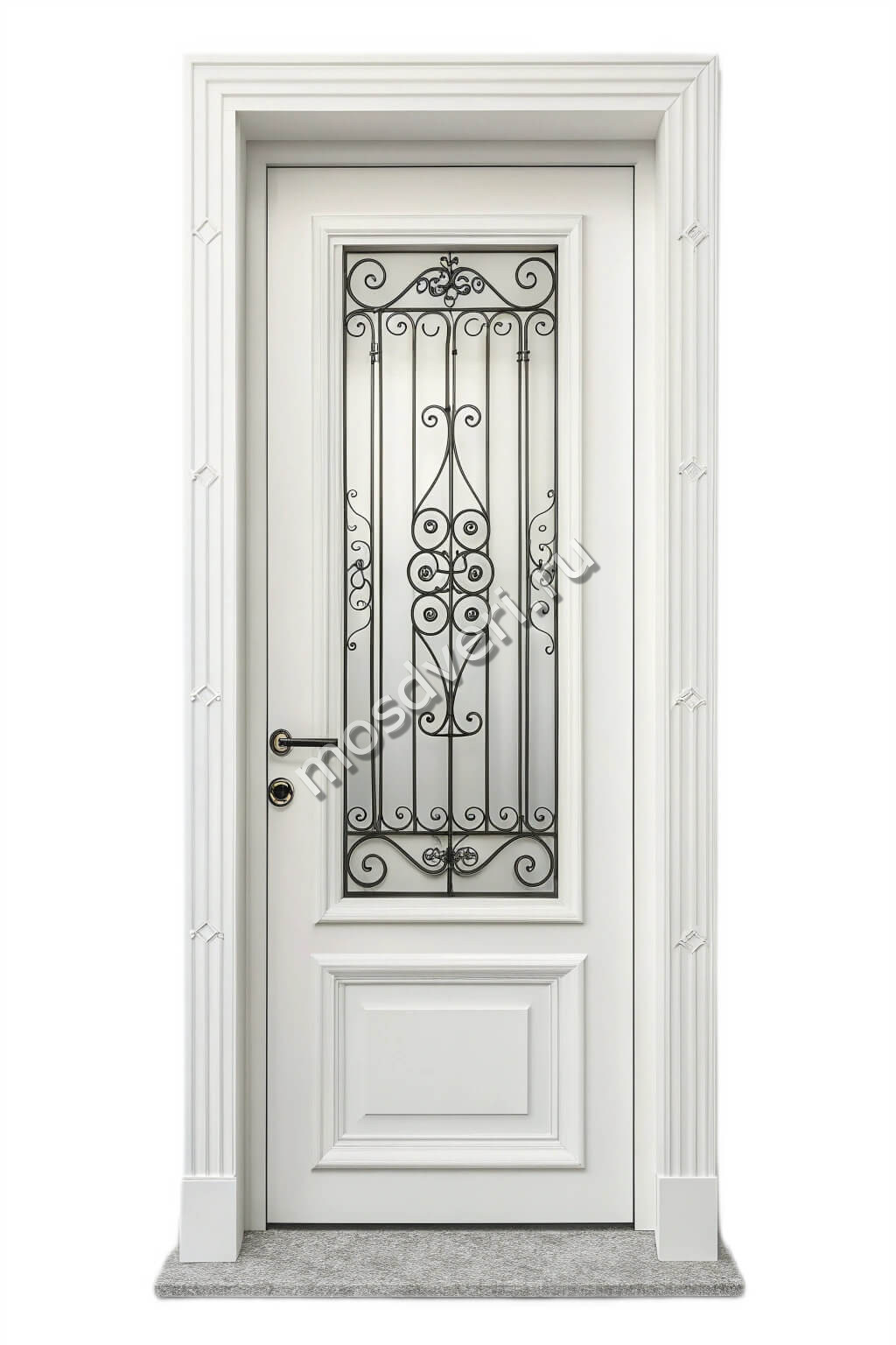 Белая входная дверь в дом с черной кованой вставкой БДД-024 в Пушкино