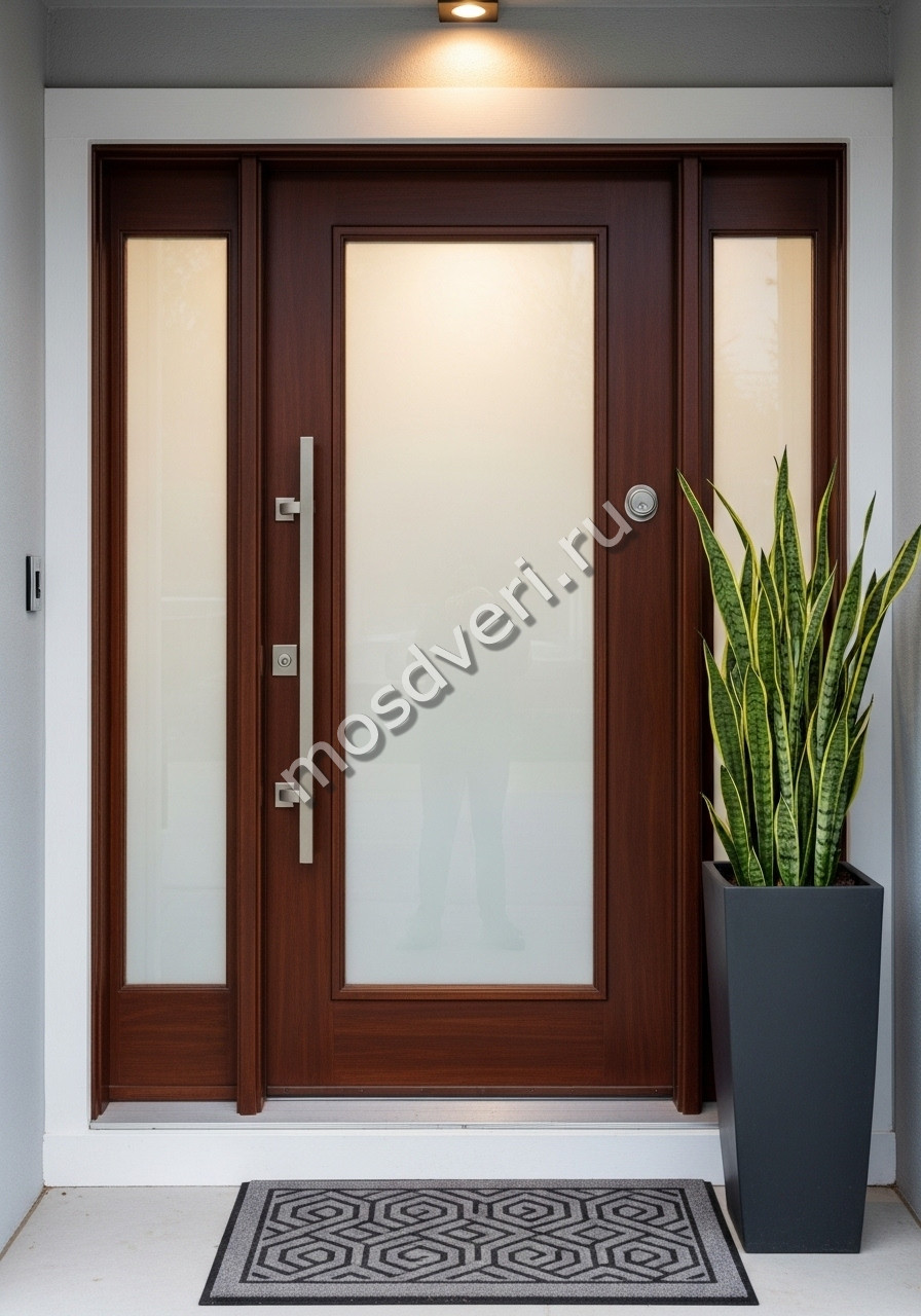 Современная входная дверь со стеклом коричневая — сочетает в себе современный дизайн и превосходные защитные характеристики.